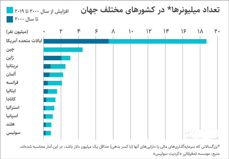 بر اساس گزارش موسسه تحقیقاتی کردیت سوئیس، در حال حاضر تعداد میلیونرهای جهان -افرادی که حداقل یک میلیون دلار سرمایه و دارایی دارند- به ۴۶٫۸ میلیون نفر رسیده است. از اواسط سال ۲۰۱۸ تاکنون شمار میلیونرها رشدی ۱٫۱ درصدی داشته است.