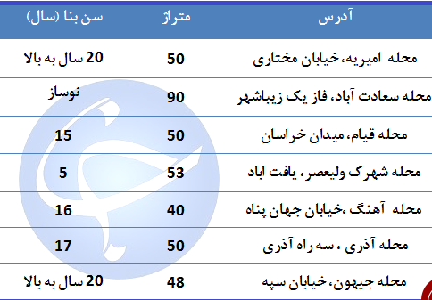 به گزارش سایت طلا لیست آپارتمان های مسکونی فروشی ۳۰۰ میلیونی در مناطق مختلف تهران به شرح زیر است. توجه کنید که قیمتها بر حسب مترمربع به تومان بوده و تقریبی است، چراکه قیمت مسکن در تهران با توجه به نوع ساختمان، امکانات، خیابان و یا نظر مالک تغییر میکند.