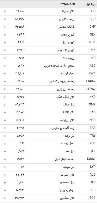 نرخ ۴۷ ارز بین بانکی در ۱۲ آبان ۹۸ / ارزهای دولتی به تعطیلات آخر هفته میلادی رفتند + جدول