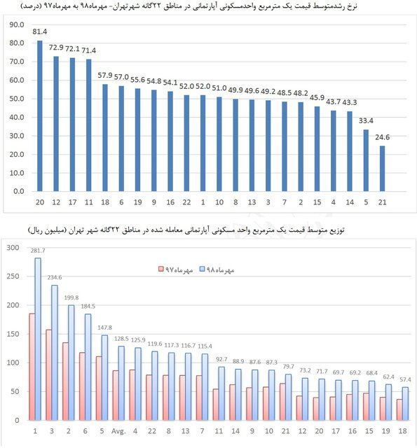 از میان مناطق ۲۲ گانه شهر تهران، منطقه یک با ۲۸.۱ میلیون تومان در هر متر مربع از بیشترین و منطقه ۱۸ با ۵.۷ میلیون تومان در هر متر مربع از کمترین متوسط قیمت برخوردار هستند. همچنین مناطق ۱، ۳، ۲، ۵ و ۶ به ترتیب مناطقی هستند که متوسط قیمت یک متر مربع آپارتمان در آنها از متوسط قیمت شهر تهران بیشتر بوده است.