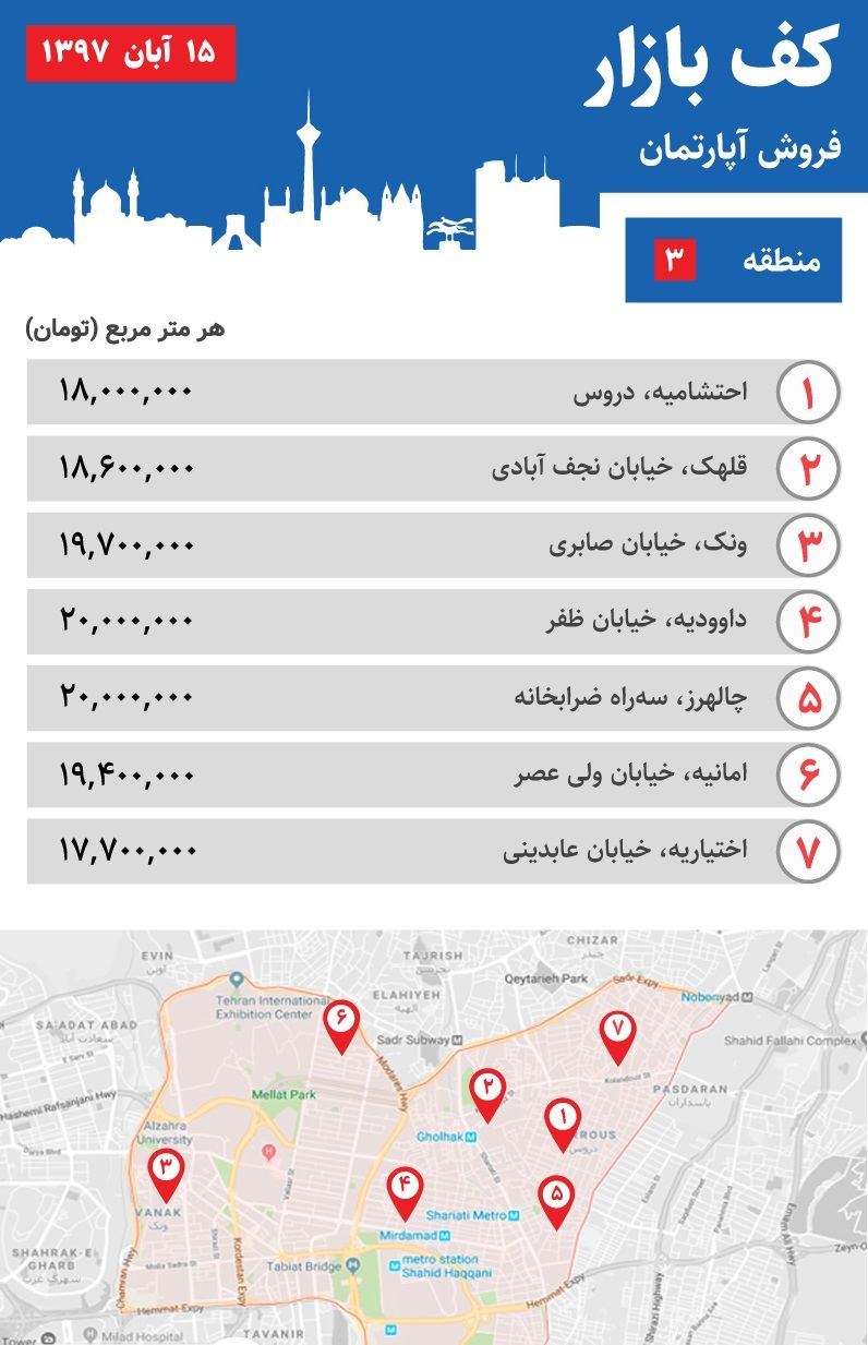 کف بازار / قیمت آپارتمان منطقه ۳ در آبان ماه ۱۳۹۸