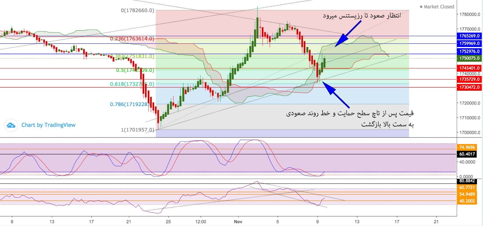 برای دوره های پیش رو صعود پیش بینی میشود و در این صعود در انتظار رسیدن قیمت به سطح 1752 و پس از آن 1757 هستیم. در صورت قرار گرفتن قیمت بالاتر از سطح 1765 انتظار ادامه صعود تا سطح مقاومت 1770 را خواهیم داشت.