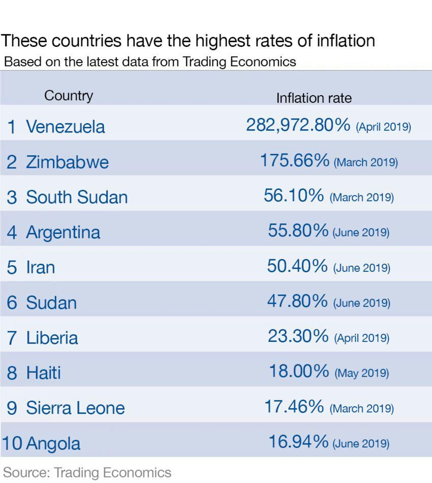 گزارش سایت طلا از تحلیل دادههای یاهو فایننس منتشره در دنیای اقتصاد، نرخ تورم ونزوئلا در آوریل سال ۲۰۱۹، ۲۸۳ هزار درصد اعلام شده است. ونزوئلا رتبه نخست تورم در میان سایر کشورها را به خود اختصاص داده است. ونزوئلا، زیمباوه، سودان جنوبی، آرژانتین، ایران، سودان، لیبریا، هاییتی، سیرالئون و آنگولا در این لیست قرار دارند