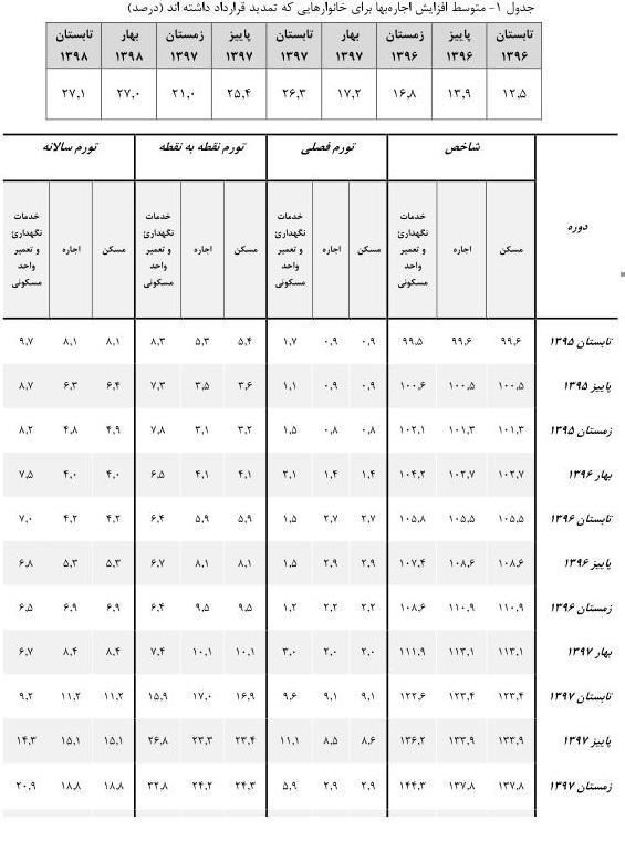 گفتنی است، متوسط افزایش هزینه اجاره بها برای کل خانوارهایی که تمدید قرارداد داشتهاند، در فصل تابستان ١٣٩٨ برابر با ٢٧,١ درصد است.