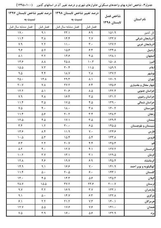 در فصل تابستان ١٣٩٨، شاخص قیمت اجاره بهای واحدهای مسکونی در مناطق شهری، به عدد ١٥١,٩ رسید که نسبت به فصل قبل (١٤٢.� )، ٦.٩ درصد افزایش داشته است. در این فصل بیشترین نرخ تورم فصلی مربوط به استان لرستان با ٢٣.٦ درصد افزایش و کمترین آن مربوط به استان آذربایجان شرقی با ٢.٧ درصد افزایش میباشد.