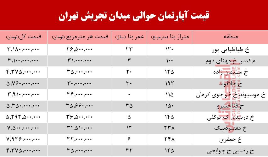 قیمت آپارتمان حوالی میدان تجریش؟ +جدول