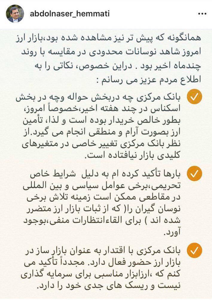 رئیس کل بانک مرکزی در یادداشت جدید اینستاگرامی نسبت به رشد قیمت دلار واکنش نشان داد.