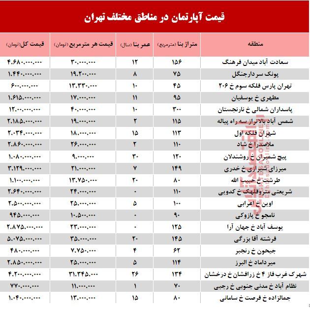 به گزارش سایت طلا به نقل از اقتصاد انلاین قیمت اپارتمانهای درج شده در این جدول مربوط به اعلام سامانه اطلاعات بازار املاک ایران می باشد.