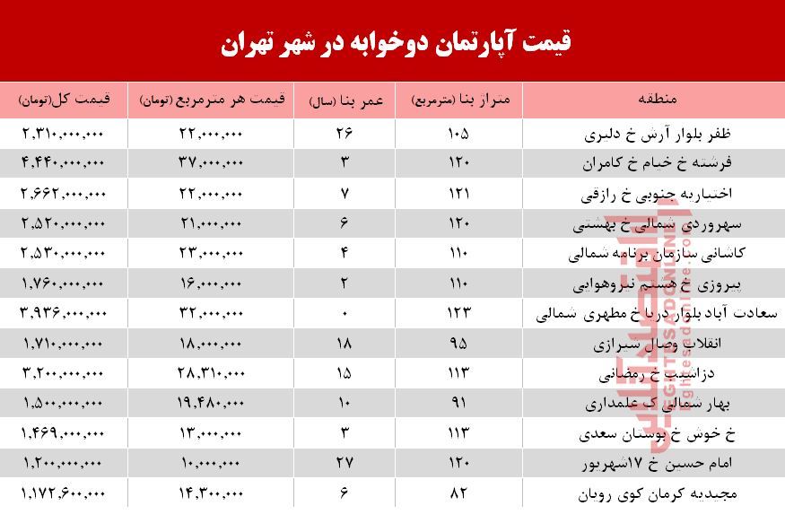 قیمت آپارتمان دوخوابه در شهر تهران چند است؟ +جدول