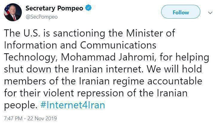 توییتر این وزارتخانه نیز علت تحریم آذری جهرمی را سانسور اینترنتی در ایران خوانده است.