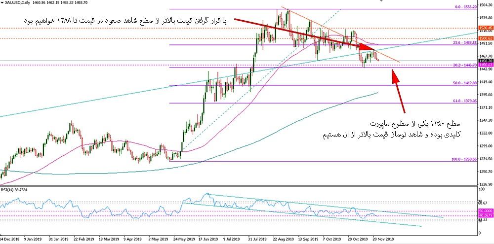 در صورت شکست سطح ۱۴۵۰ و قرار گرفتن قیمت زیر این سطح شاهد نزول قیمت تا سطح ۱۴۳۰ خواهیم بود.