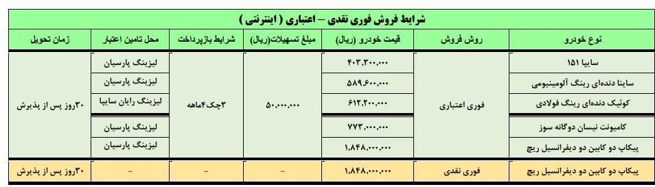 به گزارش سایت طلا به نقل از اقتصاد نیوز ، طرح فروش نقد و اقساط تعدادی از محصولات سایپا ویژه آذرماه 98 آغاز شد.در این طرح فروش خودروهای سایپا 151 ، ساینا دنده ای ، کوئیک دنده ای ، کامیون نیسان، پیکاپ دو کابین به صورت نقدی به فروش میرسد.
