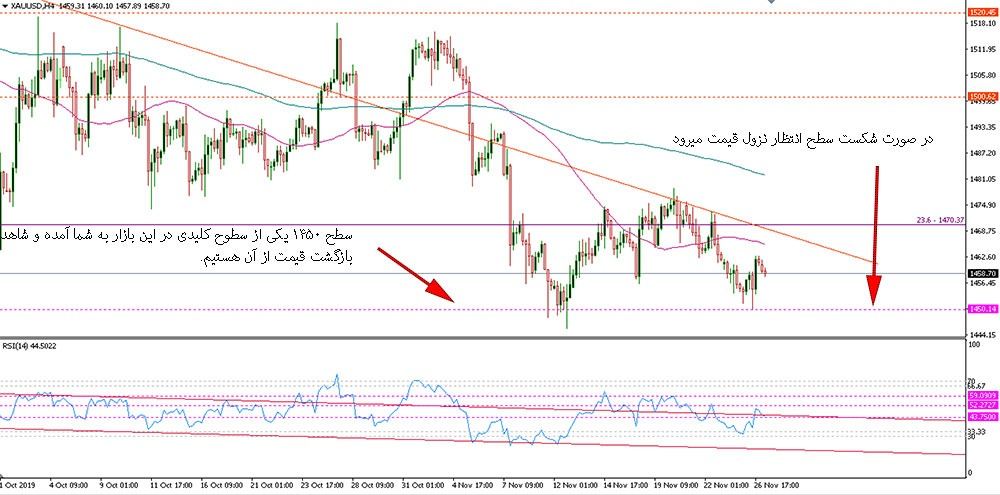 روز گذشته قیمت طلا تا سطح ۱۴۵۰ نزول داشت و مجددا از این سطح به سمت بالا بازگشت. همانطور که میدانیم این سطح یکی از سطوح حمایت کلیدی در این بازار به شمار آمده و قیمت به آن واکنش زیادی میدهد و پیشتر نیز به عنوان یک سطح مقاومتی در برابر قیمت عمل کرده است.