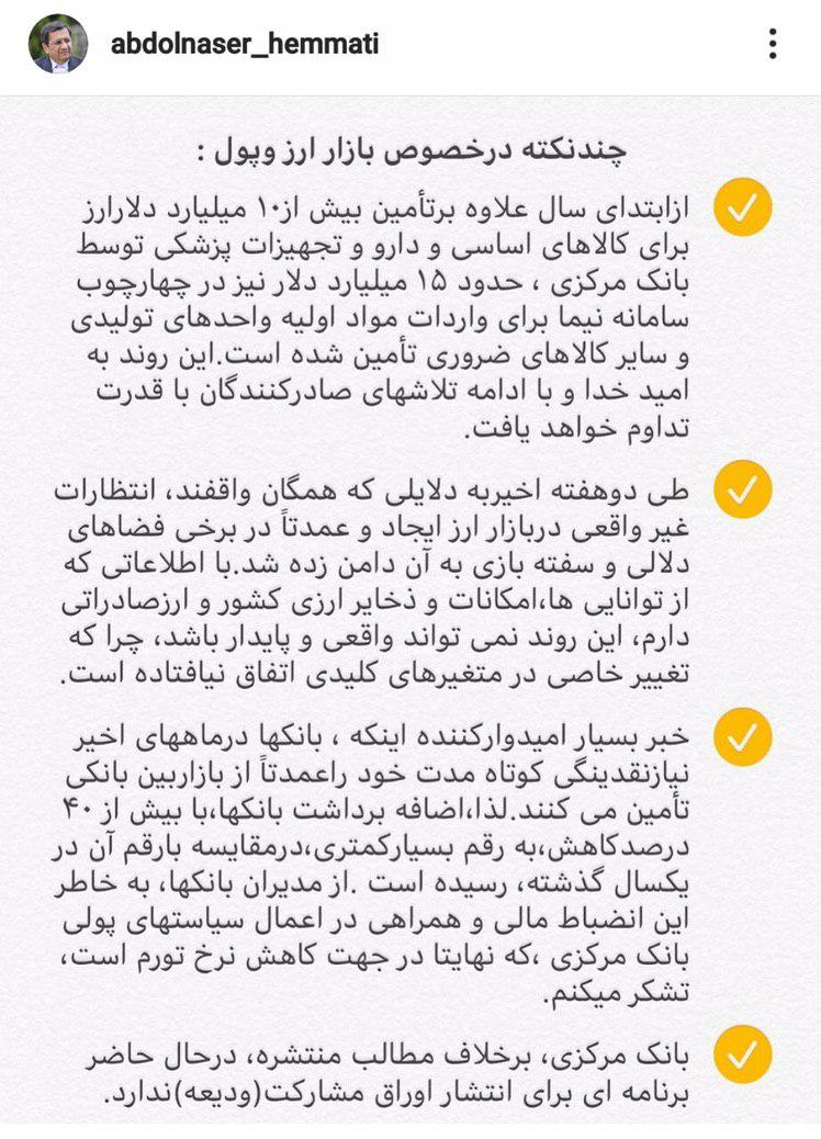 به گزارش سایت طلا ، عبدالناصر همتی در پست اینستاگرامی اظهار کرد: علاوه بر اینکه از ابتدای سال بیش از ۱۰ میلیارد دلار ارز برای واردات کالاهای اساسی، دارو و تجهیزات پزشکی توسط بانک مرکزی تامین شده است، حدود ۱۵ میلیارد دلار نیز در چارچوب سامانه نیما برای واردات مواد اولیه واحدهای تولیدی و سایر کالاهای ضروری تامین شده است.