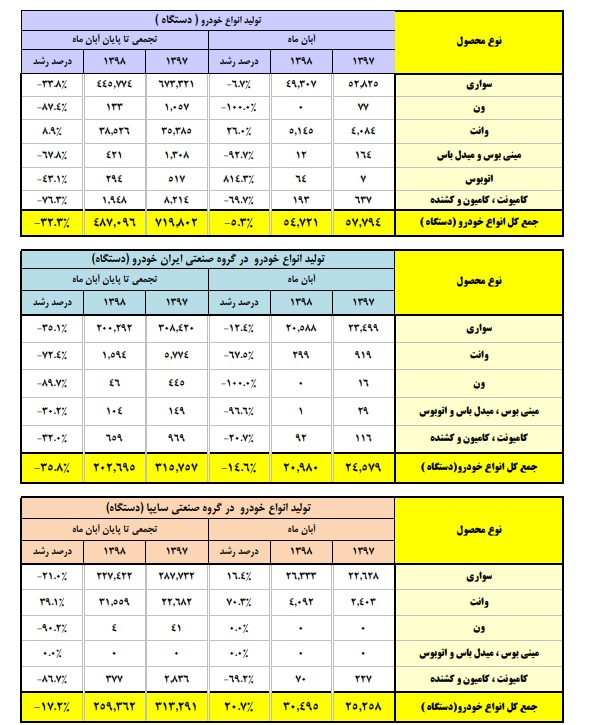 در آبان امسال تولید انواع خودرو توسط این گروه خودروسازی با کاهش 14.6 درصدی به 20 هزار و 980 دستگاه رسیده است.