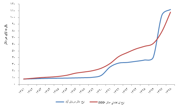 نمودار ۱- مقایسه نرخ ارز بازار آزاد و نرخ ارز تعادلی بر اساس روش PPP (سال پایه ۱۳۸۱)
