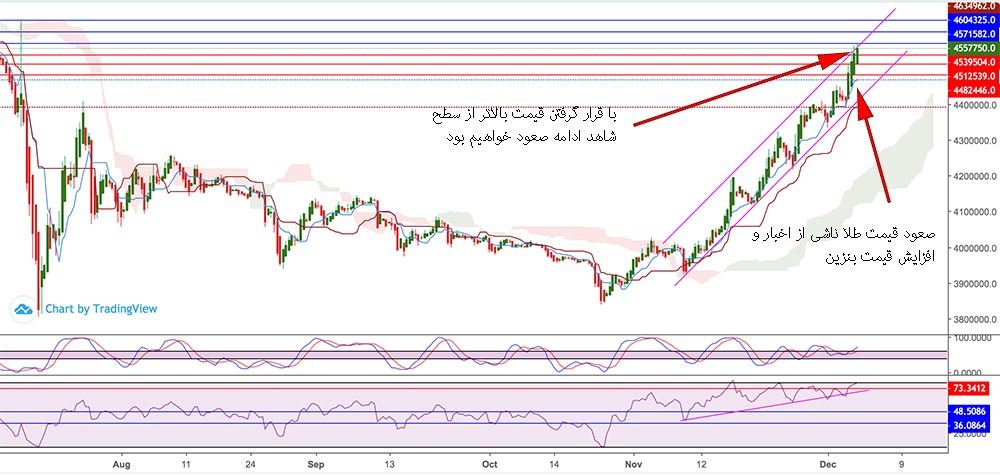 در هفته گذشته شاهد صعود در قیمت سکه امامی تا سطح مقاومتی ۴۵۶۰۰۰۰ تومان بودیم. قیمت پس از رسیدن به این سطح اندکی بازگشت قیمت داشت. با قرار گرفتن قیمت بالاتر از سطح رزیستنس کانال صعودی(4570000)در انتظار ادامه صعود در قیمت خواهیم بود .