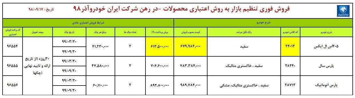 طرح جدید فروش اقساطی محصولات ایران خودرو امروز یکشنبه هفدهم آذر ماه اجرا میشود. در این طرح فروش پژو پارس سال با قیمت مصوب ۷۸ میلیون ۳۳۳ هزار و ۸۴۰ تومان و با پرداخت ۷۰ میلیون ۶۶۰ هزار تومان و پژو پارس اتوماتیک با قیمت ۹۸ میلیون ۹۷۸ هزار ۴۰۰ تومان و پیش با پرداخت ۸۹ میلیون و ۲۸۰ هزار تومان و پژو ۴۰۵ اس ال ایکس با قیمت ۶۷ میلیون ۹۹۸ هزار و ۴۰۰ تومان و با پیش پرداخت ۶۱ میلیون ۳۵۰ هزار تومان به فروش میرسد.