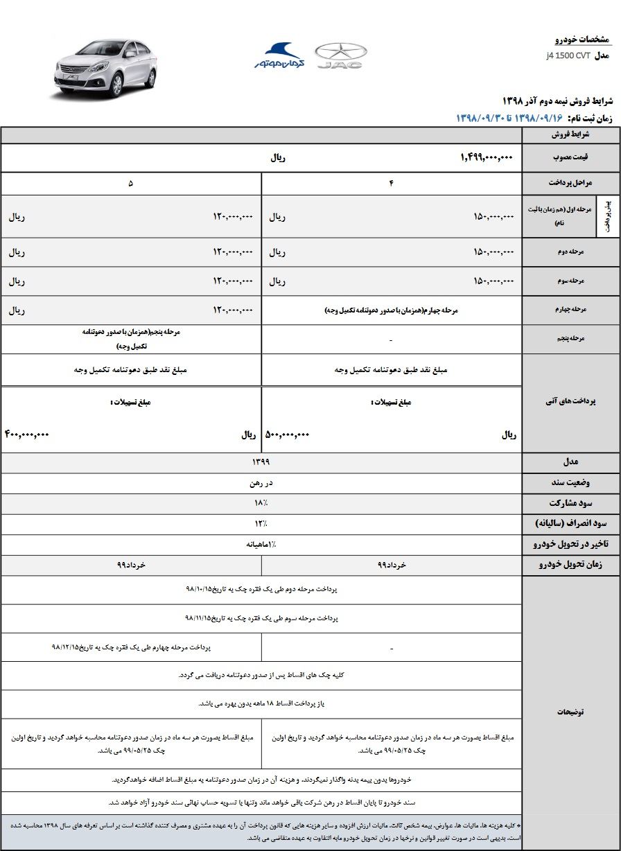 کرمان موتور شرایط پیش فروش جک J۴ با قیمت قطعی ویژه نیمه دوم آذر ماه را اعلام کرده است.