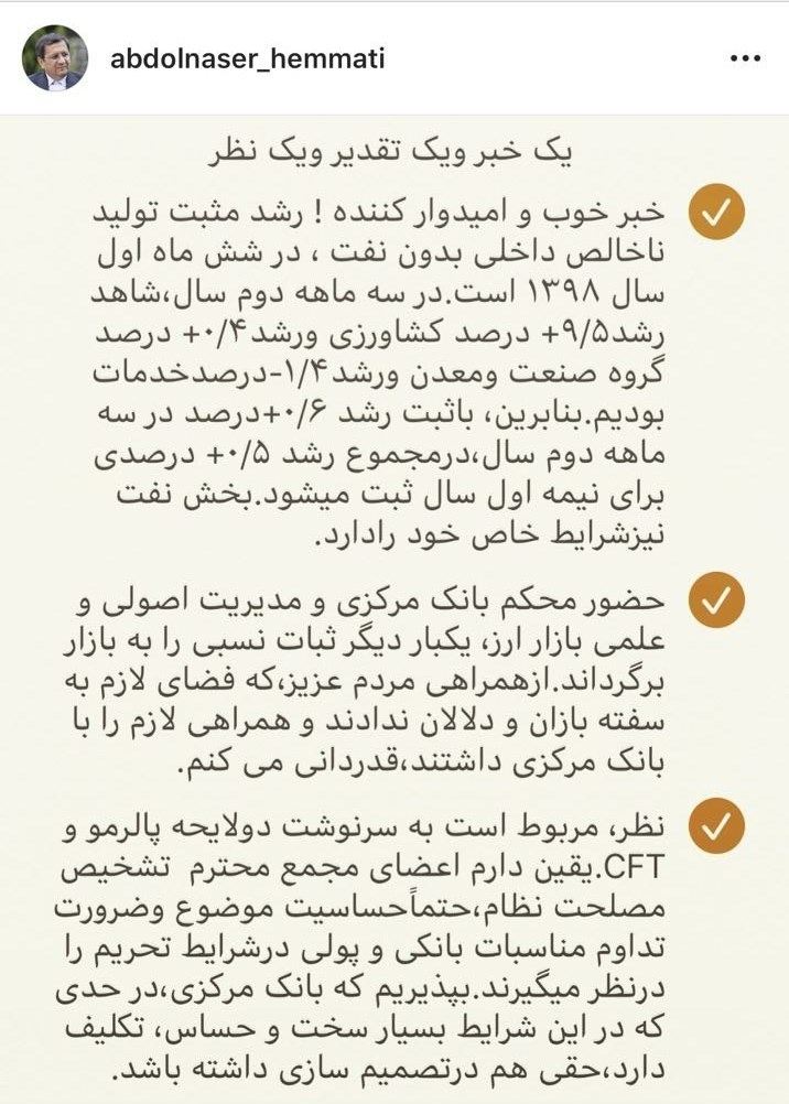 رئیس کل بانک مرکزی اعلام کرد که خبر خوب و امیدوارکننده رشد مثبت تولید ناخالص داخلی بدون نفت در شش ماه اول سال ۹۸ است.