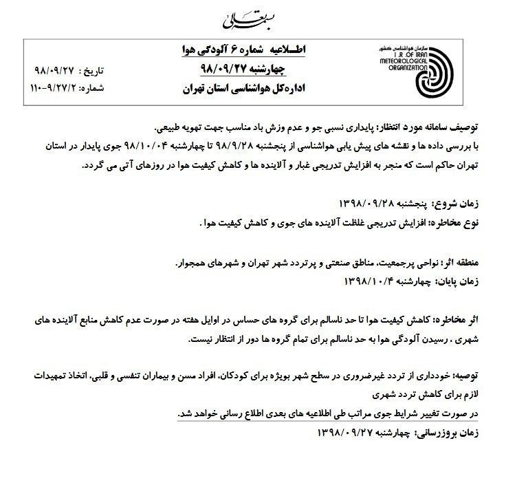 به گزارش سایت طلا ، اطلاعیه شماره 6 سازمان هواشناسی در روز چهارشنبه مورخ 98/09/27 ویژه آلودگی هوا به شرح زیر منتشر شد: