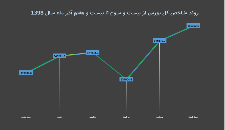 بازار سهام در آخرین هفته پاییز توانست کار خود را با رشد تمام کند؛ در همین راستا شاخص کل بورس توانست بازدهی ۳٫۲ درصدی را ثبت و بیش از ۱۰ هزار واحد نیز رشد کند.معاملات در بازار بورس در هفته جاری روندی رو به رشد داشت و هرچند در برخی روزها شاهد کاهش ارزش معاملات بودیم، اما این بازار همواره سبزپوش بود. طبق آمار و ارقام، روز یکشنبه بالاترین تعداد معاملات به ارزش بیش از ۳۲۰۳ میلیارد تومان در بورس ثبت شد.