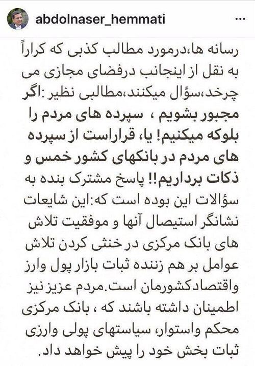 عبدالناصر همتی، رئیس کل بانک مرکزی اعلام کرد: رسانهها در مورد مطالب کذبی که کرارا به نقل از اینجانب در فضای مجازی میچرخد، سوال میکنند. مطالبی نظیر اگر مجبور شویم، سپردههای مردم را بلوکه میکنیم! یا قرار است از سپردههای مردم در بانکهای کشور خمس و زکات برداریم.