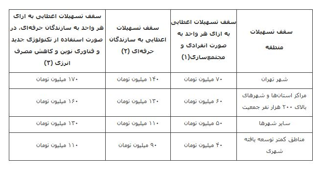 همچنین، سقف تسهیلات اعطایی به سازندگان حرفهای در تهران ۱۴۰ میلیون تومان، در مراکز استانها و شهرهای بالای ۲۰۰ هزارنفر جمعیت ۱۳۰ میلیون تومان، سایر شهرها ۱۱۰ میلیون تومان و مناطق کمتر توسعه یافته شهری ۹۰ میلیون تومان است.