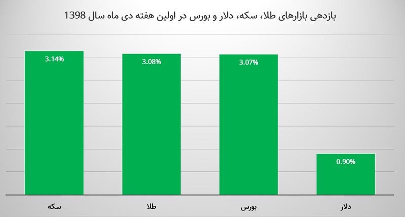 در اولین هفته از دی ماه امسال، همه بازارهای مالی صعودی ظاهر شدند. فلزات طلایی در اولین هفته دی ماه بیشترین بازدهی را به خود اختصاص دادند.بازار طلا، ارز و بورس در اولین هفته دی ۹۸، با ثبات نسبی همراه بوده است به گونهای که در آغار هفته شاهد افزایش جزئی در بازار بوده ایم که در اواسط هفته به ثبات و آرامش رسید و در روزهای پایانی هفته کاری به کاهش اندکی رسید.