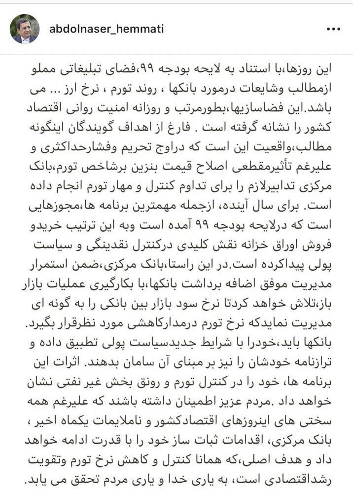 به گزارش سایت طلا ، عبدالناصر همتی در تازهترین یادداشت اینستاگرامی نوشت: " این روزها،با استناد به لایحه بودجه 99،فضای تبلیغاتی مملو از مطالب و شایعات درمورد بانکها ، روند تورم ، نرخ ارز ... می باشد. این فضاسازی ها، بطورمرتب و روزانه امنیت روانی اقتصاد کشور را نشانه گرفته است.