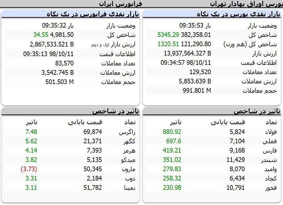 نمادهای پر بیننده فولاد، فملی، شبندر، فارس، وامید، کچاد، فخوز با روند صعودی کار خود را آغاز کرد.