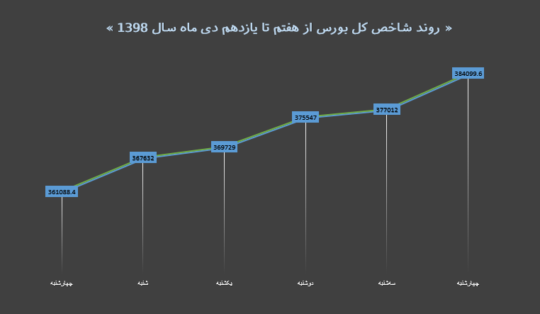 بازار در روز چهارشنبه به اوج خود رسید و شاخص کل در این روز ۳۸۴ هزار و ۹۹ واحد بود. تعداد معامله انجام شده در روز چهارشنبه ۶۵۱ هزار معامله به ارزش ۳۲ هزار و ۱۶۱ میلیارد تومان بود.