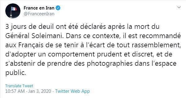 سفارت فرانسه در تهران در پی شهادت سردار سلیمانی و اعلام سه روز عزای عمومی در ایران، به شهروندان فرانسوی توصیه کرد از حضور در اجتماعات عمومی بپرهیزند و اقدام به عکاسی نکنند.