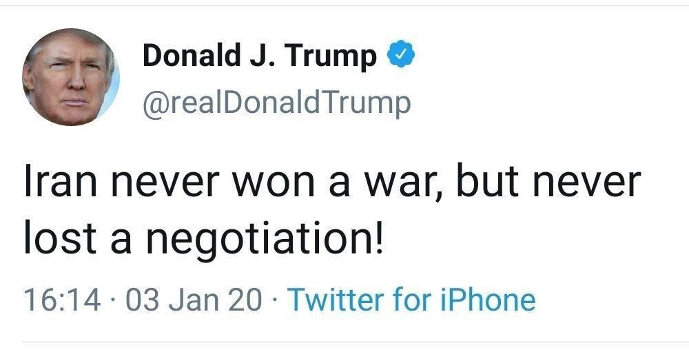به گزارش سایت طلا ، دونالد ترامپ، رئیس جمهور آمریکا در پی اقدام تروریستی دولت این کشور در به شهادت رساندن سردار قاسم سلیمانی، فرمانده پیشین نیروهای قدس سپاه پاسداران، در پیامی توییتری یکی از اظهارات پیشین خود را در هشتم مرداد سال جاری، بازنشر داده و نوشت: ایران هرگز برنده هیچ جنگی نبوده، اما هیچگاه هم بازنده یک مذاکره نبوده است.
