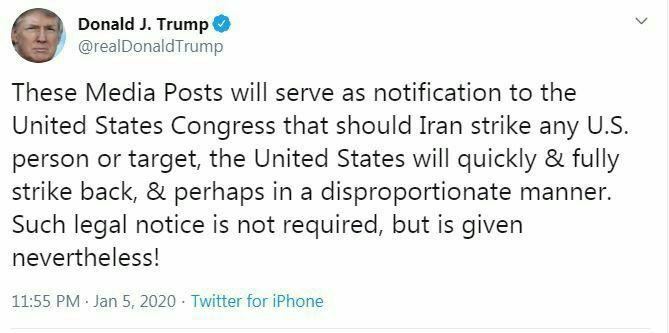 محمد جواد ظریف وزیر خارجه جمهوری اسلامی ایران نیز به این توئیت ترامپ واکنش نشان داده و هشدار داده است که چنین حملاتی نقض آشکار قوانین بین المللی است.