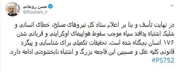 جمهوری اسلامی ایران از این اشتباه فاجعه بار بسیار متأسف است و اینجانب از سوی جمهوری اسلامی ایران به خانوادههای قربانیان این فاجعه دردناک، عمیقا تسلیت عرض می کنم و به کلیه دستگاههای ذیربط دستور میدهم که تمامی اقدامات لازم برای جبران، همدردی و دلجویی از ایشان به عمل آورند. همچنین ضمن ابراز تأسف شدید، همدردی دولت ایران را به ملتها، دولتها و خانوادههای قربانیان غیرایرانی تقدیم مینمایم. وزارت امور خارجه، همکاری کامل کنسولی برای شناسایی و بازگرداندن پیکرهای قربانیان به خانوادههایشان را به عمل می آورد.