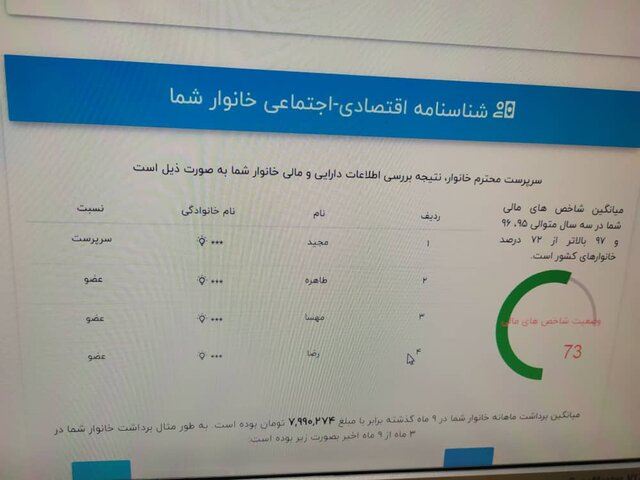 بر اساس آنچه در سایت حمایتی مشاهده میشود، برای هر سرپرست خانوار شناسهای اقتصادی ـ اجتماعی ایجاد و نتیجه بررسی اطلاعات مالی و دارائی خانوار ارائه شده است.