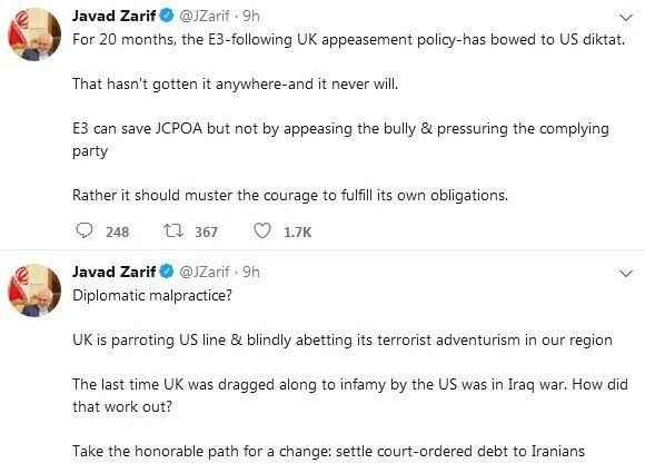 به گزارش سایت طلا ، محمدجواد ظریف وزیر امور خارجه ایران در پی اقدامات و اظهارات نا به جای اخیر مقامات انگلیسی و بیانیه سه کشور اروپایی در صفحه توئیترش نوشت: