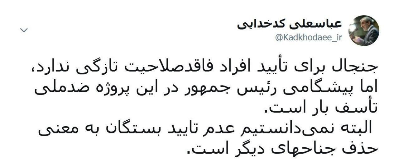 انتقاد کدخدایی به صحبتهای امروز رییس جمهور در مورد افراد فاقد صلاحیت