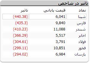 امروز عمده نمادهای مهم بورسی در کاهش شاخص کل موثر بودند که از جمله می‌توان به پالایش نفت اصفهان، پتروشیمی خلیج فارس، پالایش نفت بندرعباس، مخابرات ایران، فولاد مبارکه، فولاد خوزستان و گسترش نفت و گاز پارسیان اشاره کرد.