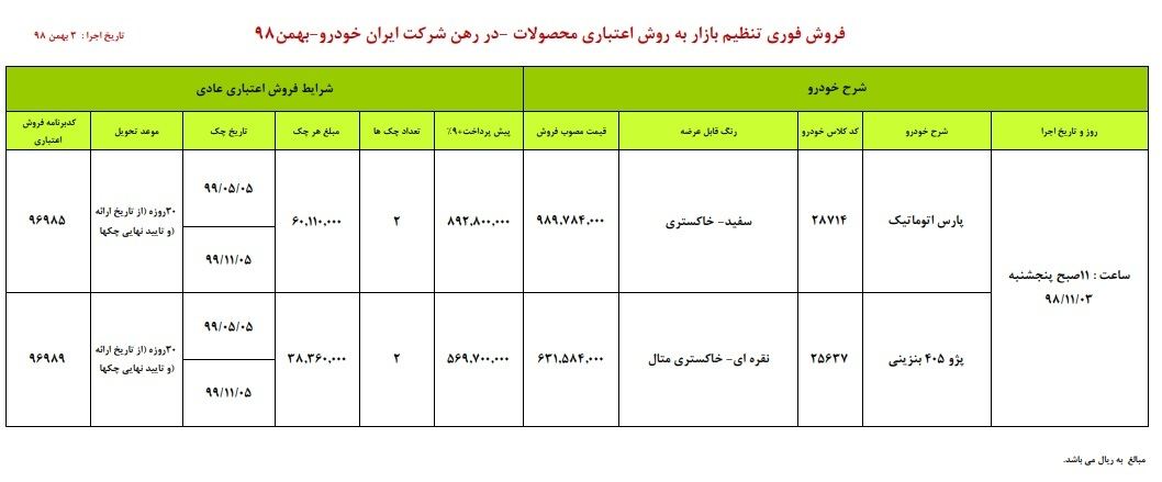به اطلاع کلیه نمایندگان محترم شرکت ایران خودرو میرساند، شرایط فروش اعتباری محصولات ایران خودرو به تعداد بسیار محدود از ساعت ۱۱ صبح روز پنجشنبه مورخ ۹۸/۱۱/۰۳ و تا زمان تکمیل ظرفیت به شرح جدول پیوست و با شرایط ذیل ارائه میگردد: