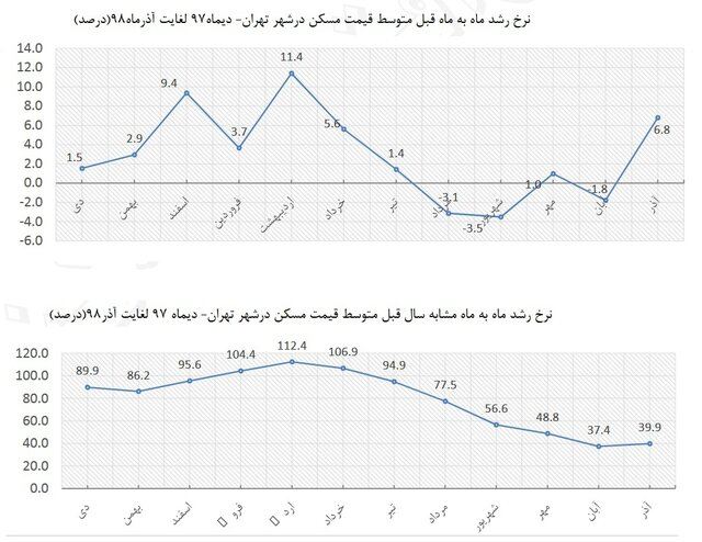 مقایسه نمودار رشد نقطه به نقطه سالانه قیمت نیز از کند شدن روند افزایش قیمت حکایت دارد. آذرماه سال ۱۳۹۷ متوسط قیمت هر متر مربع مسکن شهر تهران ۹ میلیون و ۶۳۰ هزار تومان بود که نسبت به ماه مشابه سال قبل از آن ۹۳ درصد افزایش یافت؛ در حالی که این عدد برای آذر امسال ۴۰ درصد بوده است.