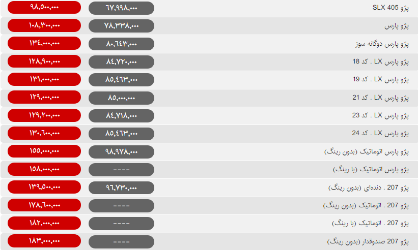 به گزارش سایت طلا سهم پژو پارس از افزایش قیمت امروز محصولات ایران خودرو، گرانی یک میلیون و ۸۰۰ هزار تومانی است که باعث شده قیمت این محصول در بازار به ۱۰۸ میلیون و ۳۰۰ هزار تومان برسد. دانگ فنگ H۳۰ امروز دو میلیون تومان گران شده و تا ۱۶۹ میلیون تومان افزایش قیمت پیدا کرده است.