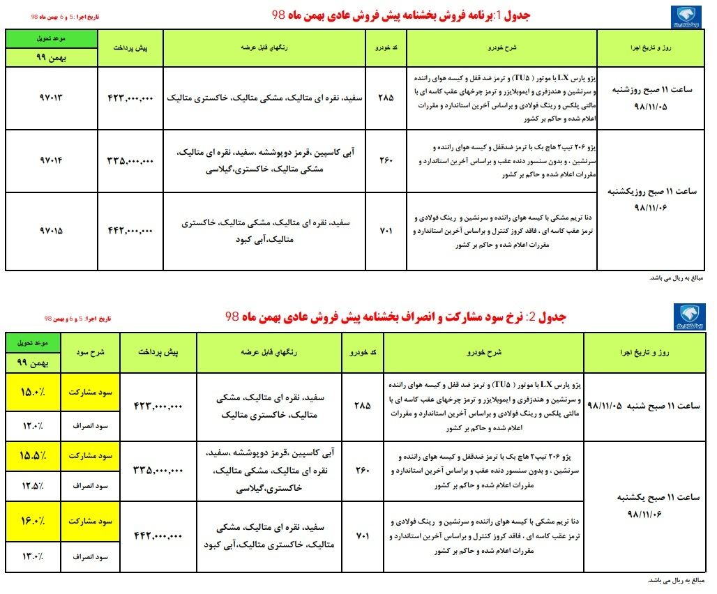به اطلاع کلیه مشتریان محترم ونمایندگیهای مجاز میرساند شرایط پیش فروش عادی شرکت ایران خودرو در ساعت ۱۱ صبح روز یکشنبه ۹۸/۱۱/۰۶ مطابق جداول پیوست و با توضیحات ذیل ارائه میگردد.