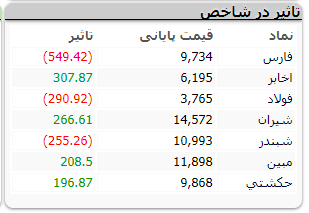 امروز نمادهای مخابرات ایران، صنایع شیمیایی ایران، مبین انرژی خلیجفارس و کشتیرانی جمهوری اسلامی در تقویت شاخص بورس اثرگذار بودند و نمادهای پتروشیمی خلیجفارس، فولاد مبارکه و پالایش نفت بندرعباس در کاهش شاخص بورس اثرگذار بودهاند.