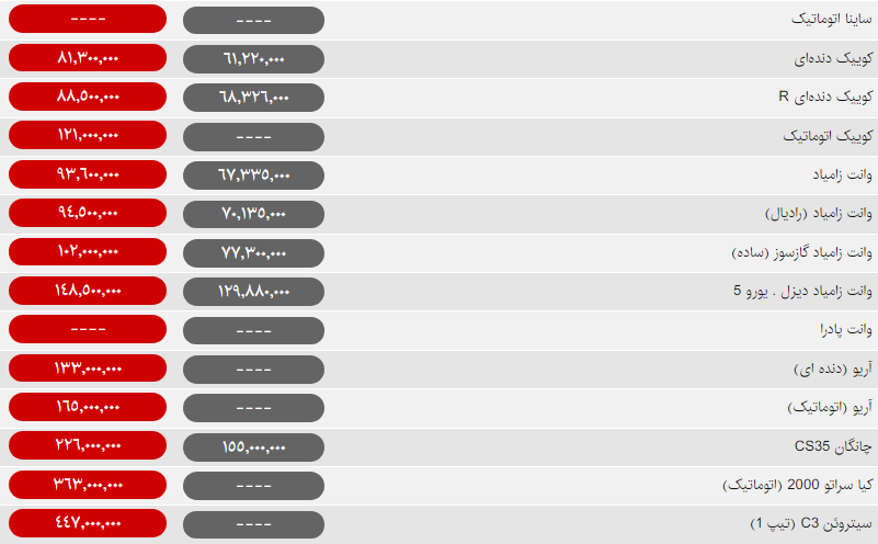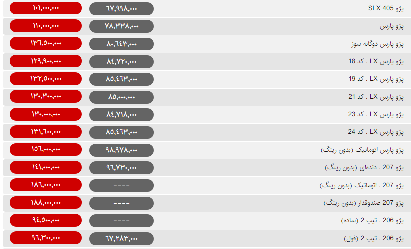 طبق آخرین قیمت بازار، پژو ۲۰۷ اتوماتیک (بدون رینگ) نسبت به قیمت خودرو در (۷بهمن ۹۸) با افزایش 5 میلیون تومانی به قیمت 186میلیون تومان رسید، همچنین کیا سراتو ۲۰۰۰ (اتوماتیک) به نرخ 363میلیون تومان فروخته شد که این عدد بیانگر افزایش 4 میلیون تومانی است.