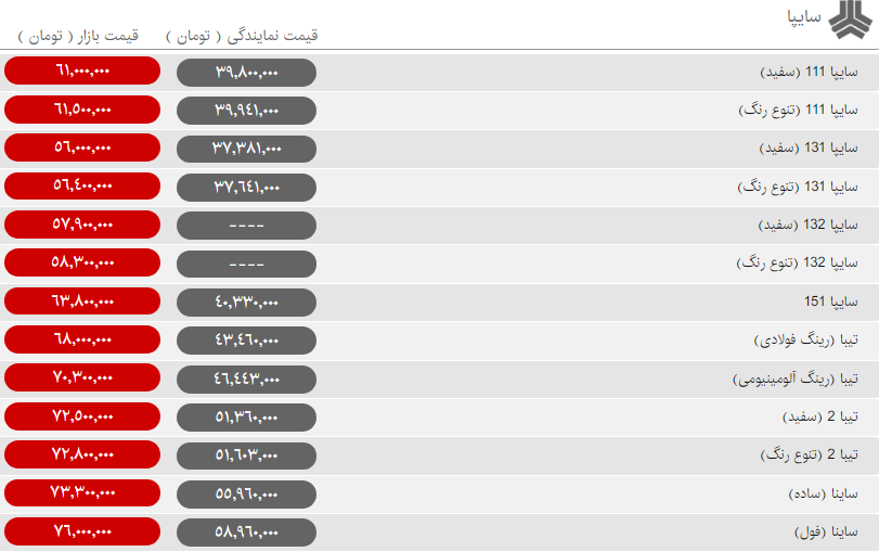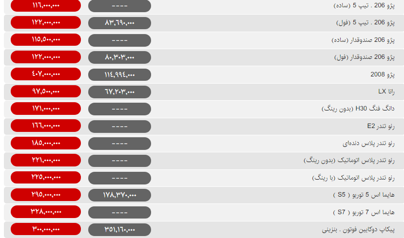 سمند ال ایکس ۹۱ میلیون تومان و پژو ۲۰۶ تیپ ۵ (ساده) ۱۱۶ میلیون تومان معامله شدند که این اعداد بیانگر افزایش یک میلیون تومانی است.