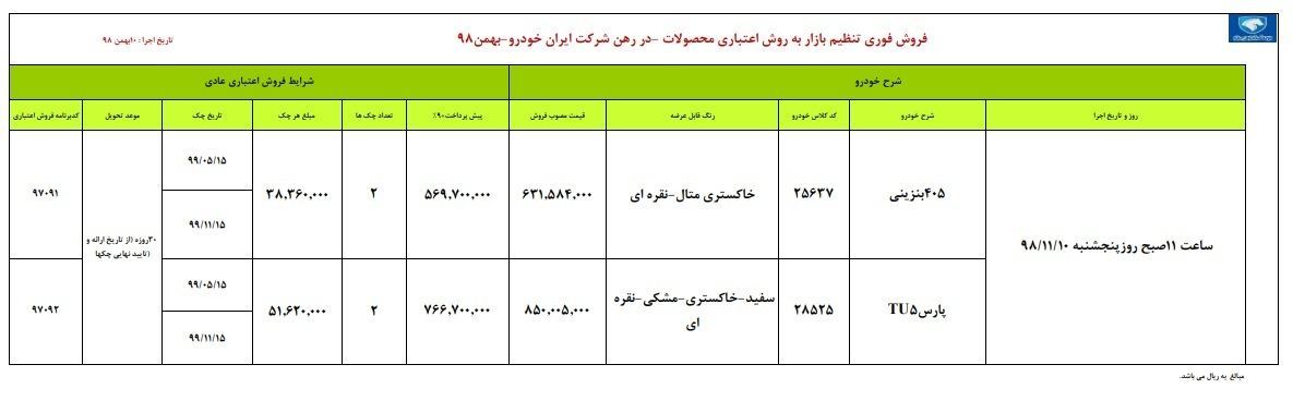 به اطلاع کلیه نمایندگان محترم شرکت ایران خودرو میرساند، شرایط فروش اعتباری محصولات ایران خودرو به تعداد بسیار محدود از ساعت ۱۱ صبح روز پنجشنبه مورخ ۹۸/۱۱/۱۰ و تا زمان تکمیل ظرفیت به شرح جدول پیوست و با شرایط ذیل ارائه میگردد: