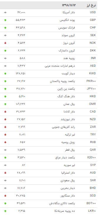 در اولین روز هفته جاری، نرخ دلار و یورو با ۱۰۰تومان افزایش روی تابلوی صرافی ملی نمایان شد.همچنین بانک مرکزی نرخ رسمی ۴۷ ارز را اعلام کرد بر این اساس نرخ ۱۲ ارز بین بانکی ثابت ماند، ۱۹ ارز کاهش و ۱۶ ارز نیز افزایش یافت.