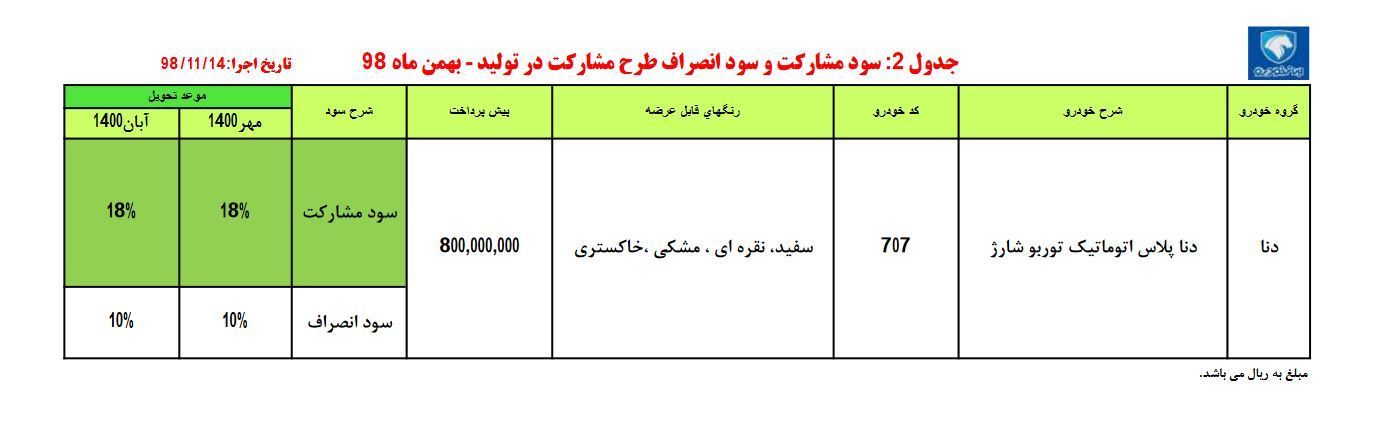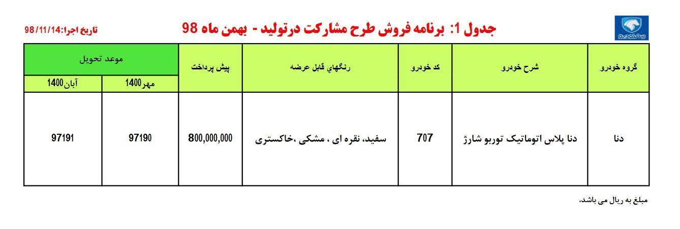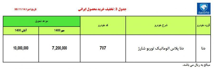 بر اساس اعلام شرکت ایران خودرو دنا پلاس توربو اتوماتیک از ساعت 11 روز دوشنبه 14 بهمن به صورت اینترنتی در وبسایت فروش ایران خودرو عرضه می شود.
